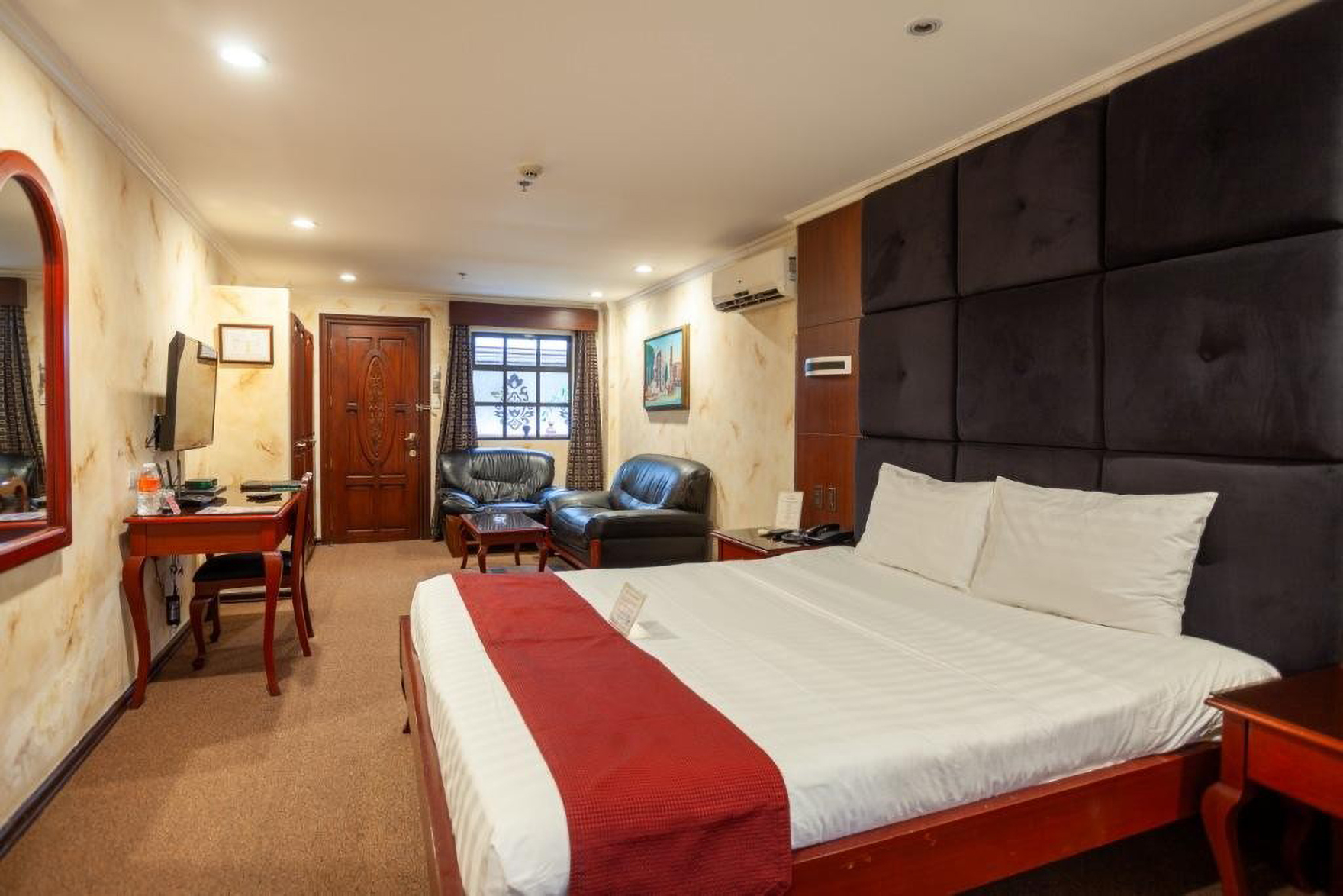 This Room is approx. 42 square meters with Wall to Wall Carpeting, Decorative Wall Paint, King Size Bed, Coil Spring Mattress, 2 side tables, 40" LCD TV, DVD Player, Desk & Chair, Wired and Wi-Fi Internet Connection, Refrigerator, Mini Bar, Personal Safe, Telephone and a Full Length Mirror. A plush 2 seat leather sofa, a plush leather arm chair, coffee table and end table.