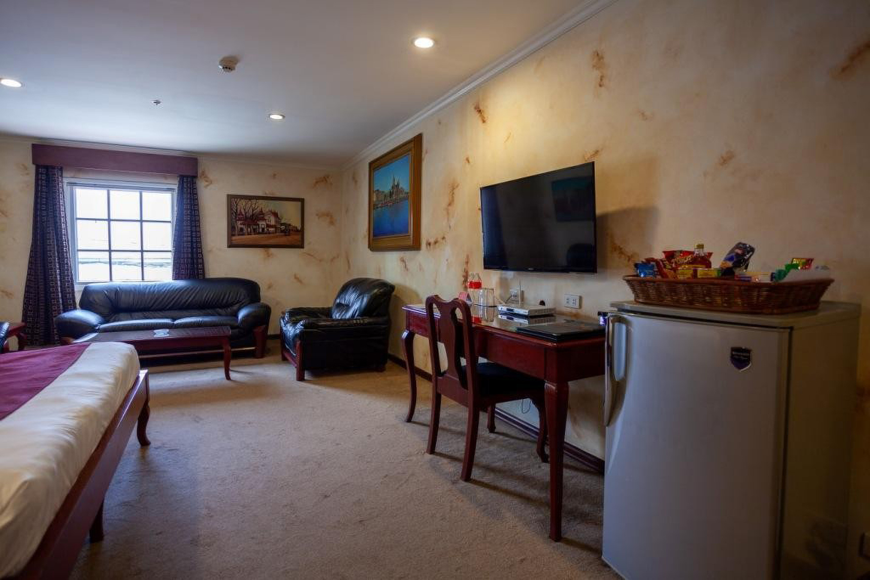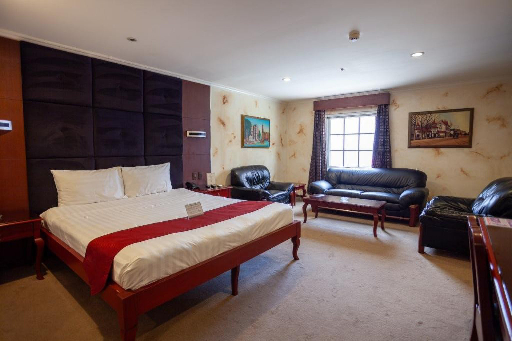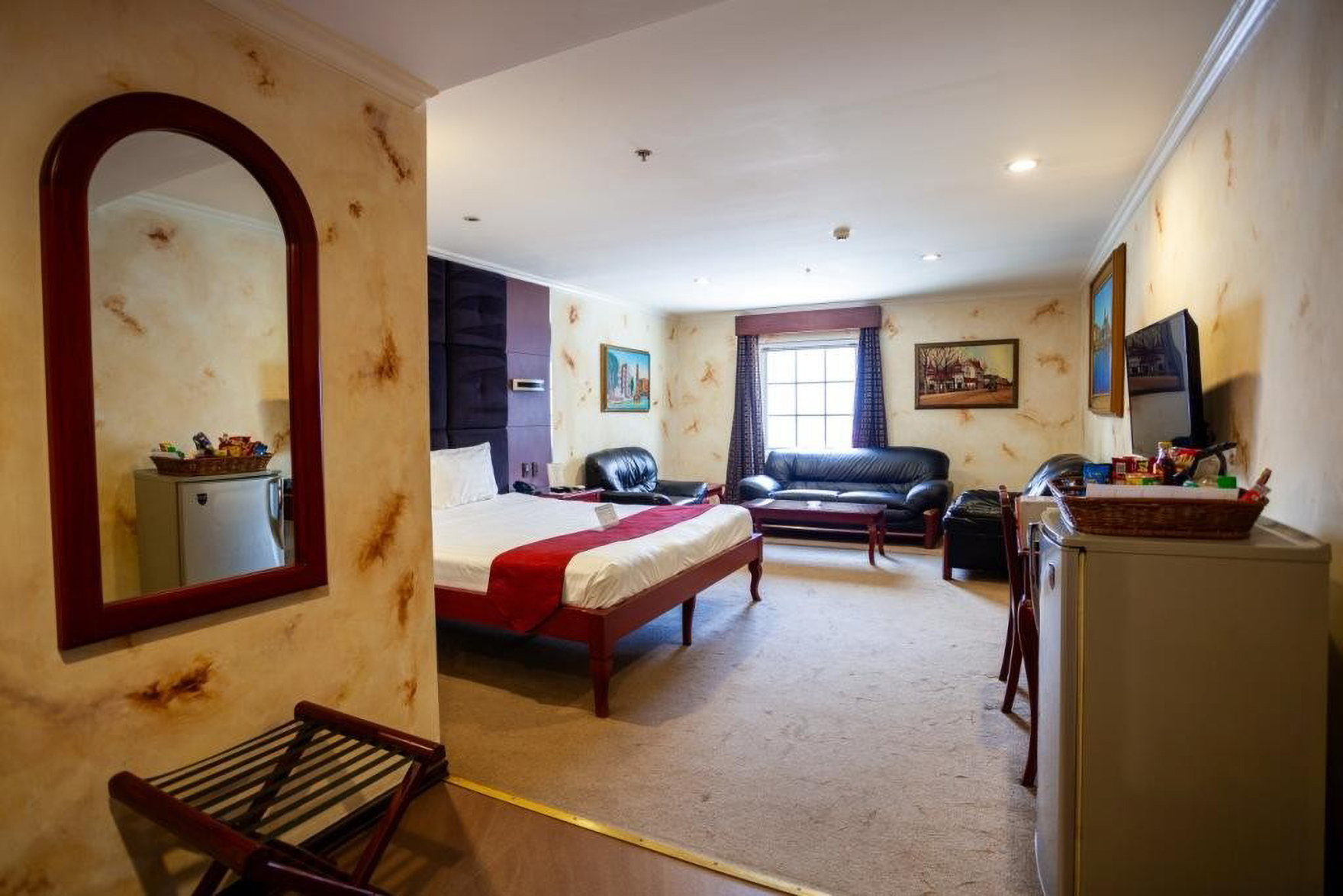 This Room is approx. 42 square meters with Wall to Wall Carpeting, Decorative Wall Paint, King Size Bed, Coil Spring Mattress, 2 side tables, 40" LED TV, DVD Player, Desk & Chair, Wired and Wi-Fi Internet Connection, Refrigerator, Mini Bar, Personal Safe, Telephone and a Full Length Mirror. This Luxury Room comes with a 3 Seat Plush Leather Sofa, 2 Plush Leather Arm Chairs, Coffee Table, and End Table.