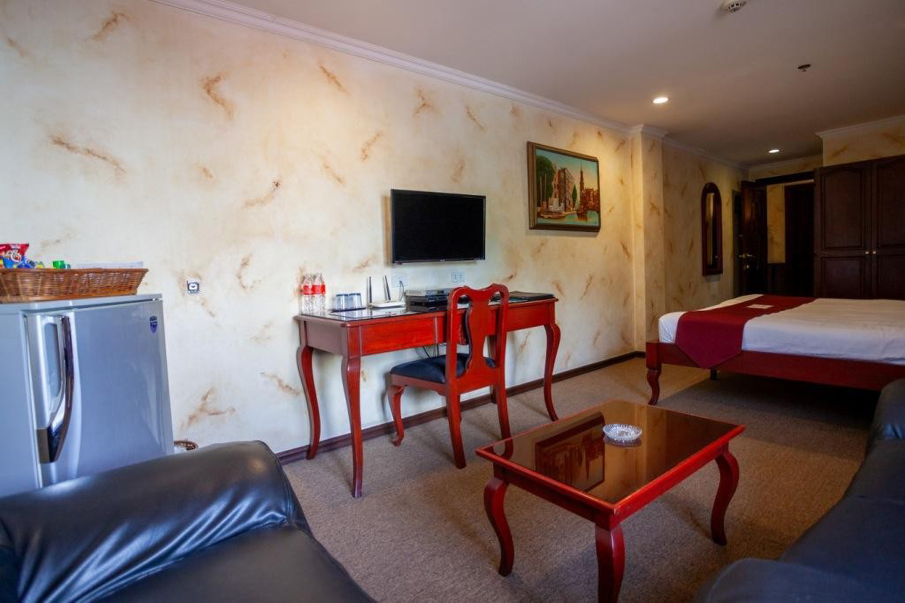This Room is approx. 32 square meters with Wall to Wall Carpeting, Decorative Wall Paint, King Size Bed, Coil Spring Mattress, 2 side tables, 32" LED TV, DVD Player, Desk & Chair, Wired and Wi-Fi Internet Connection, Refrigerator, Mini Bar, Personal Safe, Telephone and a Full Length Mirror. Superior Rooms come with either a 2 seat Leather Sofa and Coffee Table or with a Nice Table Set with 2 Leather Chairs.
