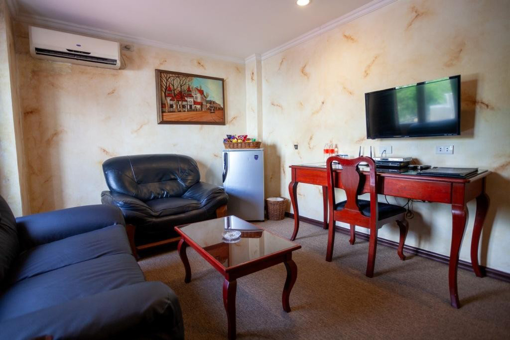 This Room is approx. 32 square meters with Wall to Wall Carpeting, Decorative Wall Paint, King Size Bed, Coil Spring Mattress, 2 side tables, 32" LED TV, DVD Player, Desk & Chair, Wired and Wi-Fi Internet Connection, Refrigerator, Mini Bar, Personal Safe, Telephone and a Full Length Mirror. Superior Rooms come with either a 2 seat Leather Sofa and Coffee Table or with a Nice Table Set with 2 Leather Chairs.